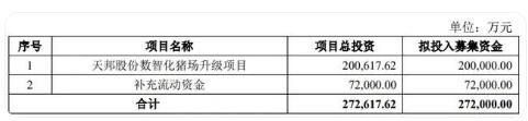 11月20日,天邦食品發(fā)布公告,擬募集資金總額(含發(fā)行費(fèi)用)不超過272000萬元(含272000萬元),扣除發(fā)行費(fèi)用后的募集資金凈額將用于數(shù)智化豬場升級項(xiàng)目及補(bǔ)充流動資金。其中,數(shù)智化豬場升級項(xiàng)目擬投入募集資金200000萬元,補(bǔ)充流動資金擬投入募集資金72000萬元。