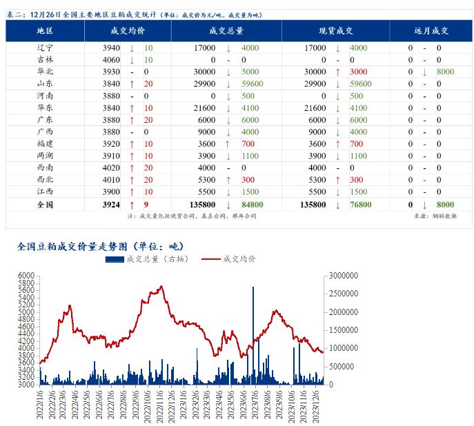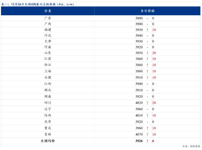 12月26日油廠豆粕報價穩(wěn)中上調(diào),其中沿海區(qū)域油廠主流報價在3850-3930元/噸,廣東3880元/噸穩(wěn)定,江蘇3860漲10元/噸,山東3850漲20元/噸,天津3930元/噸穩(wěn)定。