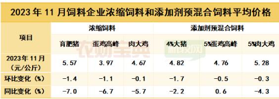 濃縮飼料同比降幅更為明顯。2023年11月,育肥豬濃縮飼料平均價格為5.57元/公斤,折合5570元/噸,環(huán)比下降1.4%,同比下降7.0%。