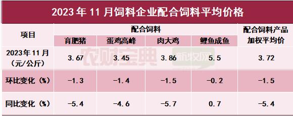 據(jù)樣本企業(yè)數(shù)據(jù)測算,2023年11月,育肥豬配合飼料平均價格為3.67元/公斤,折合3670元/噸,環(huán)比下降1.3%,同比下降5.4%。