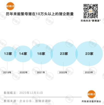 據(jù)新豬派統(tǒng)計(jì),擁有10萬(wàn)頭以上能繁母豬的豬企由2019年的19家增至2022年的23家。2023年維持在23家,均為T(mén)OP20豬企,其中16家為上市企業(yè)。德康農(nóng)牧是2023年唯一成功登陸資本市場(chǎng)的養(yǎng)豬企業(yè),有著超過(guò)30萬(wàn)頭的母豬規(guī)模。