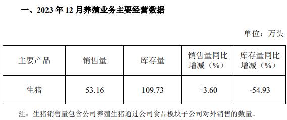 2023年1-12月,公司累計(jì)銷(xiāo)售生豬585.90萬(wàn)頭,銷(xiāo)售量同比增長(zhǎng)12.91%。