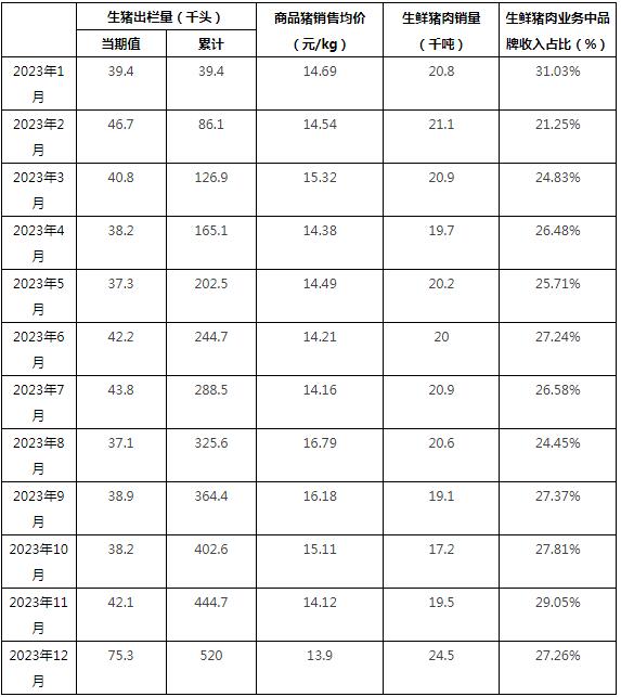 中糧家佳康1月10日公布2023年12月運(yùn)營快報。公司12月生豬出欄量75.3萬頭;商品豬銷售均價13.9元/公斤;生鮮豬肉銷量2.45萬噸;生鮮豬肉業(yè)務(wù)中品牌收入占比27.26%。于2023年1-12月,生豬出欄量520萬頭,同比增加26.74%。
