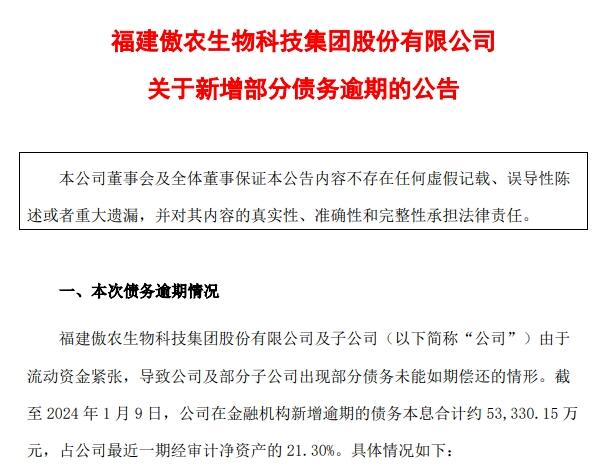 傲農(nóng)生物:截至2024年1月9日,新增逾期的債務(wù)本息合計約5.33億元