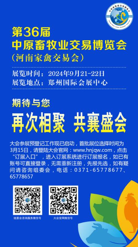 第36屆中原畜牧業(yè)交易博覽會(河南家禽交易會)將于2024年9月21-22日在鄭州國際會展中心召開,大會參展預登記工作現(xiàn)已啟動,首批展位選擇時間為3月15日,請登陸大會官網(wǎng):www.hnjqw.com,點擊“訂展入口”,進入訂展系統(tǒng)進行訂展報名,如已有賬號可直接登錄,無需重新注冊,先報先選,如有疑問請咨詢組委會,電話:0371-65778677、65778657。