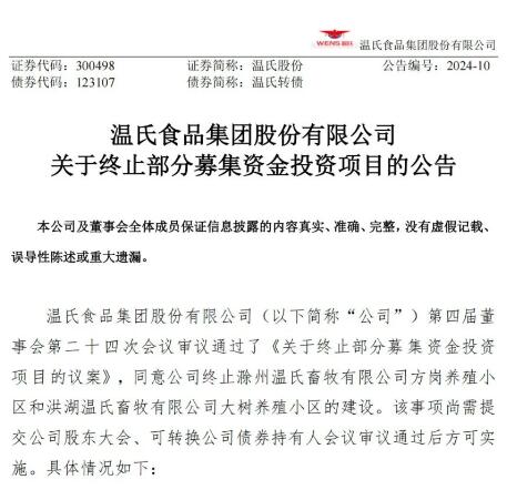 溫氏擬終止2個(gè)養(yǎng)殖項(xiàng)目,涉及資金1.94億元,生豬規(guī)模18萬頭