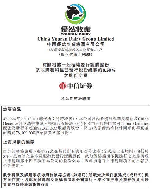 2月19日,中國優(yōu)然牧業(yè)集團有限公司發(fā)布公告,該公司及公司全資附屬內(nèi)蒙優(yōu)然與華夏基耐及China Genetics訂立該等協(xié)議。