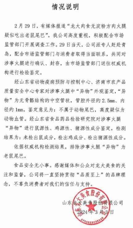“龍大美食”微信公眾號3月3日發(fā)布情況說明:2月29日,有媒體報道“龍大肉食無淀粉方肉火腿疑似吃出老鼠尾巴”。我公司高度重視,積極配合市場監(jiān)管部門開展調查工作。29 日當天,公司派專人趕赴青島,配合市場監(jiān)管部門與消費者取得當面聯系,共同對涉事火腿進行確認、封存,由市場監(jiān)管部門送往權威機構進行檢驗鑒定。