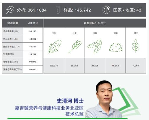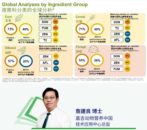 嘉吉2023年全球霉菌毒素報(bào)告,是嘉吉經(jīng)過(guò)收集、整理和分析覆蓋全球43個(gè)國(guó)家的原料樣品、基于嘉吉全球?qū)嶒?yàn)室的36萬(wàn)多次原料樣品檢測(cè)分析、按照嘉吉的霉菌毒素風(fēng)險(xiǎn)閾值*進(jìn)行評(píng)價(jià)而形成。其中,有約8.5萬(wàn)份針對(duì)中國(guó),這可能是全球和中國(guó)的最大數(shù)據(jù)庫(kù)。年度報(bào)告還新增了飼草數(shù)據(jù),這對(duì)于了解反芻動(dòng)物霉菌毒素風(fēng)險(xiǎn)尤為重要。