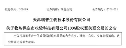 瑞普生物3月29日晚間公告,于2024年3月28日簽署《股權(quán)轉(zhuǎn)讓協(xié)議》,擬以自有資金或自籌資金2.30億元收購姚麗麗、張曉芹、天津瑞創(chuàng)生物科技合伙企業(yè)(有限合伙)持有的保定收駿 100%股權(quán)。