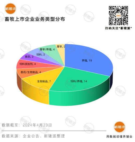 加上2021年深交所主板和中小板合并,形成了今天農(nóng)業(yè)上市公司主要在主板的局面。據(jù)新豬派不完全統(tǒng)計(jì),截至2024年4月23日,我國畜牧上市企業(yè)(僅生豬、家禽、動(dòng)保、飼料領(lǐng)域)共計(jì)60家,其中有46家分布在深交所、上交所主板,占到總數(shù)量的77%。自德康農(nóng)牧在2023年登陸資本市場后,港交所主板上市公司增至3家。上交所科創(chuàng)板公司數(shù)量最少,僅申聯(lián)生物、科前生物2家。