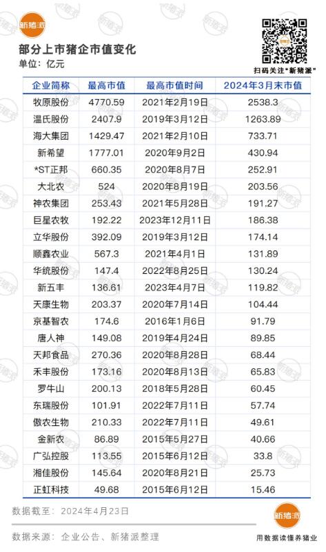 蒸發(fā)8000億!20家上市豬企市值縮水超四成,千億農(nóng)牧企業(yè)僅存牧原、溫氏、通威
