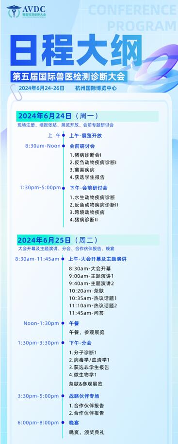現(xiàn)日程大綱已出,詳見下圖: 目前,大會(huì)各項(xiàng)籌備工作緊鑼密鼓進(jìn)行中,得到眾多行業(yè)同仁的高度關(guān)注和積極響應(yīng)。在此,我們誠(chéng)摯邀請(qǐng)國(guó)內(nèi)外獸醫(yī)檢測(cè)診斷領(lǐng)域的企業(yè)、科研院所、獸醫(yī)機(jī)構(gòu)及獸醫(yī)同行業(yè)者積極參與本屆大會(huì),共同推動(dòng)獸醫(yī)檢測(cè)診斷行業(yè)的繁榮和發(fā)展。