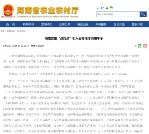 為加強動物疫病防控,切實保障牛羊肉品供應和質(zhì)量安全,進一步規(guī)范和完善引入省外動物和動物產(chǎn)品的管理,近期,海南省農(nóng)業(yè)農(nóng)村廳專門出臺了《海南省引入省外活體肉用牛羊管理辦法》和《省外活體肉用牛羊引入主體規(guī)定》兩個新規(guī),推動實施“點對點”引入省外活體肉用牛羊,推行牛羊集中交易和定點屠宰。
