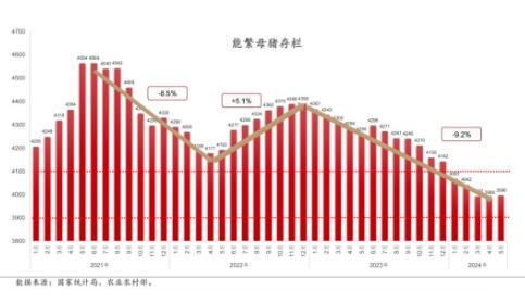 從2023年1月開始,產(chǎn)能開始去化,到2024年4月,產(chǎn)能從4,390萬(wàn)頭降到了3,986萬(wàn)頭,累計(jì)下降了9.2%??梢詫?duì)比產(chǎn)能去化幅度帶來(lái)價(jià)格上漲的高度的歷史上的經(jīng)驗(yàn)??杀刃员容^強(qiáng)的就是2022年那一波行情,當(dāng)時(shí)產(chǎn)能從4,564萬(wàn)頭降到4,177萬(wàn)頭,降到去化的幅度是8.5%。通過(guò)對(duì)比之后,發(fā)現(xiàn)現(xiàn)在產(chǎn)能是更低的,產(chǎn)能去化的幅度跟那一輪相比較也是更大的。也就是說(shuō),如果生產(chǎn)效率、消費(fèi)需求和市場(chǎng)情緒等其他所有的外部因素,假設(shè)都不變的情況下,理論上來(lái)講,這一輪價(jià)格上漲的強(qiáng)度要比2022年那波價(jià)格上漲的強(qiáng)度要強(qiáng)。