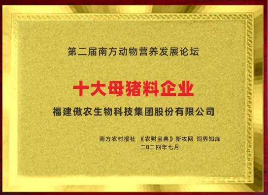 7月16日下午,由南方報業(yè)傳媒集團南方農(nóng)村報、廣州飼界知庫科技主辦,農(nóng)財寶典、新牧網(wǎng)、飼界知庫、大國漁業(yè)承辦的“2024動物營養(yǎng)系列評選”頒獎典禮在廣西南寧沃頓國際大酒店舉行。在本次頒獎典禮上,福建傲農(nóng)生物科技集團股份有限公司榮獲“十大母豬料企業(yè)”稱號。