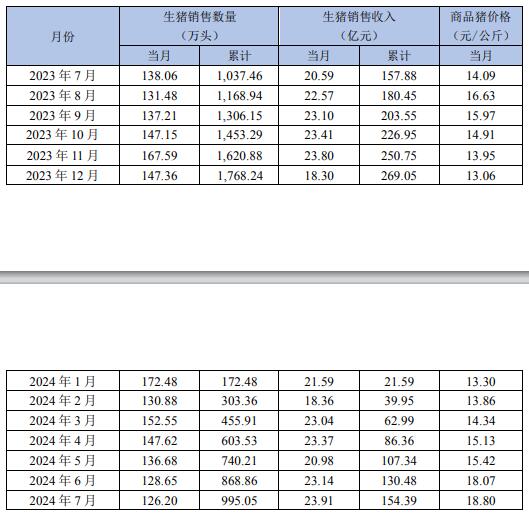新希望8月7日發(fā)布7月生豬銷售情況簡報,2024年7月銷售生豬126.20萬頭,環(huán)比變動-1.90%,同比變動-8.59%;收入為23.91億元,環(huán)比變動3.33%,同比變動16.12%;商品豬銷售均價18.80元/公斤,環(huán)比變動4.04%,同比變動33.43%。