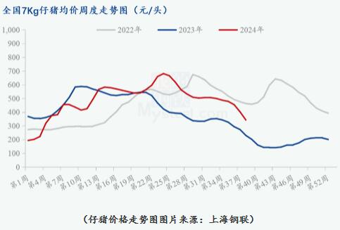 另據(jù)Mysteel數(shù)據(jù)監(jiān)測顯示,截至2024年第38周,全國7KG仔豬均價為342.86元/頭,較年內(nèi)第24周的高點680.7元/頭,已經(jīng)下跌五成。