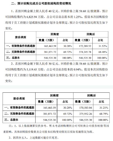 公告顯示,回購數(shù)量按回購金額上限40億元、回購價格上限58.6元/股測算,預(yù)計可回購股數(shù)約為6825.94萬股,占公司目前總股本的1.25%;按回購金額下限30億元、回購價格上限58.6元/股測算,預(yù)計可回購股數(shù)約為5119.45萬股,占公司目前總股本的0.94%。具體回購股份的數(shù)量以回購期滿時實(shí)際回購的股份數(shù)量為準(zhǔn)。