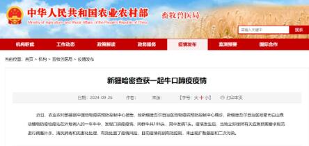 近日,農(nóng)業(yè)農(nóng)村部接到中國動物疫病預(yù)防控制中心報告,經(jīng)新疆維吾爾自治區(qū)動物疫病預(yù)防控制中心確診,新疆維吾爾自治區(qū)哈密市白山泉動植物防疫檢疫站在外地調(diào)入的一車牛中,發(fā)現(xiàn)口蹄疫疫情,同群牛共106頭,其中發(fā)病7頭。