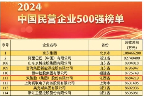 10月12日,全國工商聯(lián)在蘭州發(fā)布“2024中國民營企業(yè)500強(qiáng)”榜單。憑借著穩(wěn)健的經(jīng)營發(fā)展,2023年雙胞胎集團(tuán)實(shí)現(xiàn)營業(yè)收入868億元,榮登中國民營企業(yè)500強(qiáng)第111位,2024中國制造業(yè)民營企業(yè)500強(qiáng)第72位。