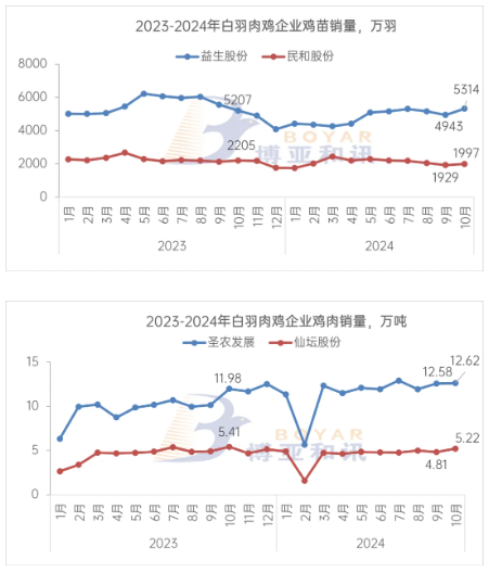 2、受部分大周齡種雞淘汰影響,2023年10月公司益生909小型白羽肉雞銷量較少,導(dǎo)致2024年10月小型白羽肉雞苗銷售數(shù)量、銷售收入同比大幅增加。