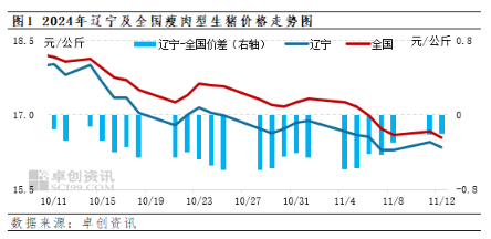 根據(jù)卓創(chuàng)資訊監(jiān)測,11月份遼寧生豬價格呈短暫上漲后下滑再低位盤整的運行態(tài)勢。2024年11月12日遼寧瘦肉型生豬交易均價16.35元/公斤,較月初累計下降0.53元/公斤,降幅3.14%。月內(nèi)最高價為1日的16.88元/公斤,最低點為7-8日的16.30元/公斤,二者相差0.58元/公斤,幅度3.44%。
