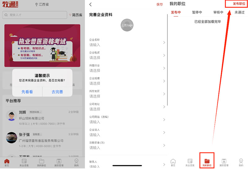 2、登錄app后,去完善【企業(yè)資料】,按照提示詳細填寫,讓求職者更好地了解企業(yè)概況。然后進行【企業(yè)認證】,完成后點擊app底部狀態(tài)欄的“我的職位”——右上角“發(fā)布職位”,按照提示填寫完成點擊“發(fā)布”。(注:若未辦理會員招聘信息不被展示在app上。)