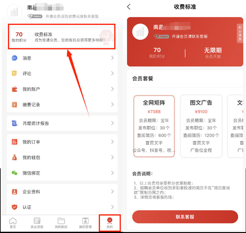 3、未開通會員,招聘信息將一直停留在“審核中”或“未通過”狀態(tài)??稍赼pp底部點擊“我的”來到個人中心頁面,點擊“收費標準”,可看到會員套餐,左右滑動可選擇開通符合企業(yè)招聘需求的套餐。也可聯系客服,讓客服為您提供周到的講解服務。