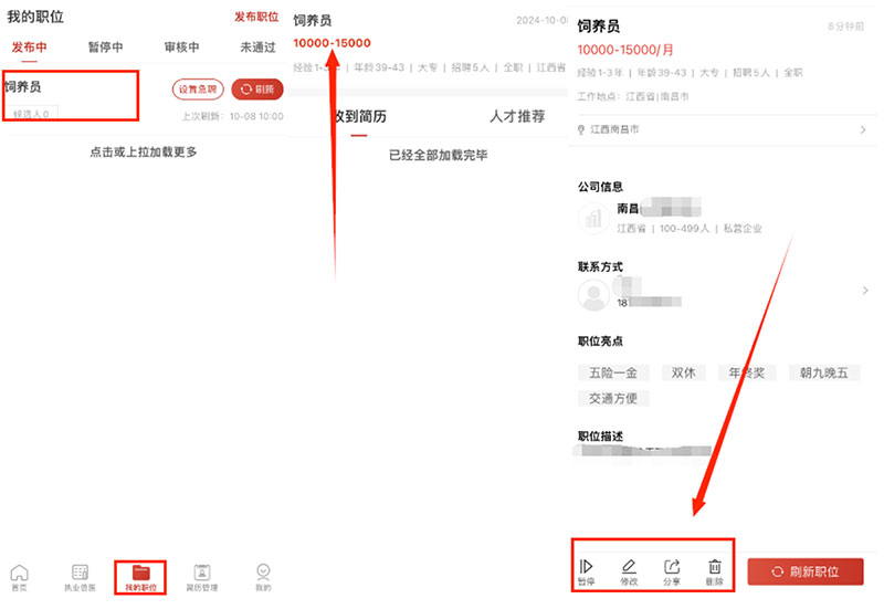 4、開通會員后,企業(yè)招聘信息成功展示,可設置“急聘”或刷新崗位(表示正在招聘中...)。如需暫停/修改/刪除正在“發(fā)布中”的某一職位信息,找到該崗位并點擊—崗位跳轉到獨立頁面后再次點擊,頁面下方有暫停/修改/刪除按鈕(如圖3),點擊需要操作的按鈕即可。