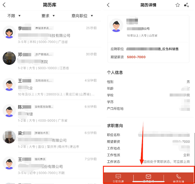 備注:只有已辦理正式會員的企業(yè)用戶才可以下載求職者簡歷,才能主動發(fā)送即時信息、面試邀約及電話溝通。