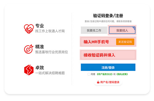 1、注冊/登錄時請?zhí)顚懻鎸嵱行У?span>電話號碼,便于您日后登陸和接收求職者應聘信息。