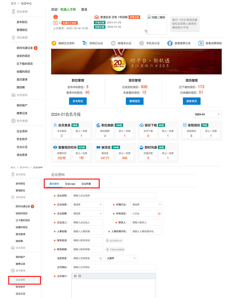 2、注冊完成后跳轉到企業(yè)會員中心。(如下方圖2)左下方找到“企業(yè)資料”,及時填寫公司詳細信息,包括基本資料、企業(yè)logo、企業(yè)形象。讓求職者更好地了解企業(yè)概況,吸引更多求職者關注。然后點擊“企業(yè)認證”,上傳企業(yè)資質材料,平臺審核通過后即可發(fā)布職位。