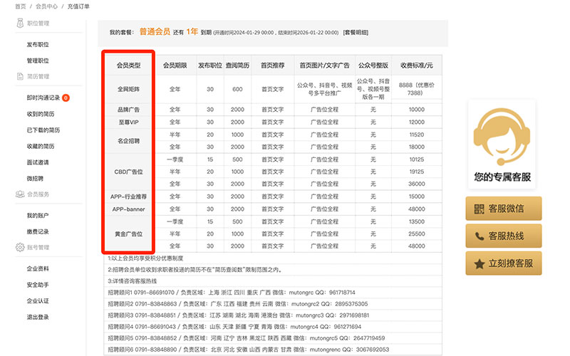 4、如下圖,點擊“開通會員”可見具體收費標準。也可前往會員中心,右側有聯系客服通道,通過咨詢客服選擇符合企業(yè)招聘需求的會員套餐。