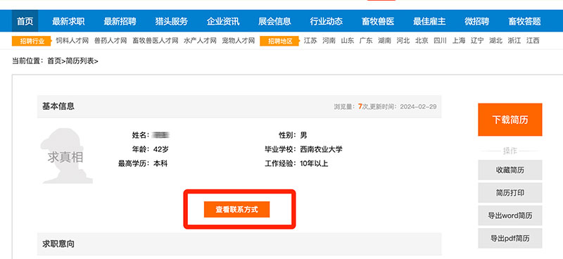 6、已辦理正式會員的企業(yè)用戶在登陸后,有權限下載查看畜牧人才的具體聯系方式。步驟為:首頁—簡歷列表,選中某一個求職者簡歷,點擊“查看聯系方式”按鈕即可。